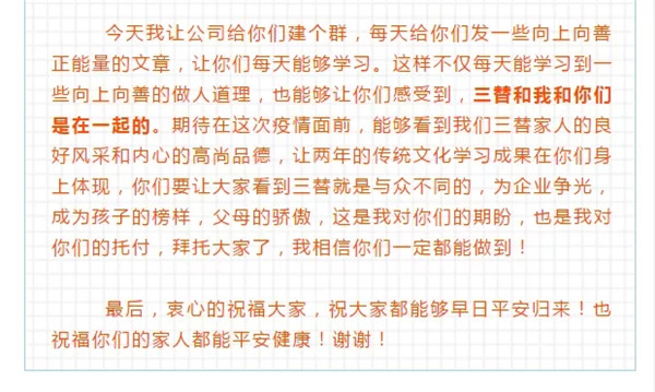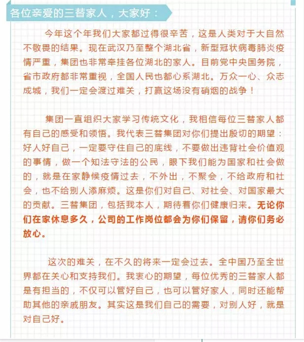 浙江省家協(xié)、杭州市家協(xié)會長單位,三替集團(tuán)在1月26日就表示暫停所有的上門服務(wù),已經(jīng)接入的客戶訂單由客服人員進(jìn)行宣傳告知,全部取消。除此之外,陶曉鶯會長給遠(yuǎn)在湖北的員工們寫了一封家書,向員工承諾,集團(tuán)嚴(yán)格遵守中央和省委的政策,讓員工安心在家休息,靜候疫情過去,并為員工保留工作崗位,這也是給全省的家政企業(yè)樹立了榜樣。