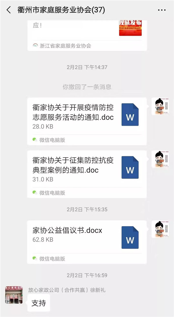 省家協(xié)副會長、衢州市家協(xié)會長單位,衢州半邊天家政服務(wù)有限公司第一時間采購大量的防護(hù)物資,及時發(fā)放,盡最大的努力保障在崗人員的身體健康,并對家政人員動態(tài)去向和健康狀況進(jìn)行了解核實,嚴(yán)格篩查。羅姿會長表示從自身給行業(yè)做表率,堅守誠信,禁止任何服務(wù)收費漲價行為,積極與客戶溝通,妥善處理因疫情形成的業(yè)務(wù)調(diào)整,對客戶合理需求給予充分保障。衢州市家協(xié)也向全市企業(yè)和員工發(fā)出了《衢州市家庭服務(wù)業(yè)協(xié)會公益倡議書》以及《關(guān)于開展疫情防控志愿者服務(wù)活動的通知》,積極參與疫情防控。